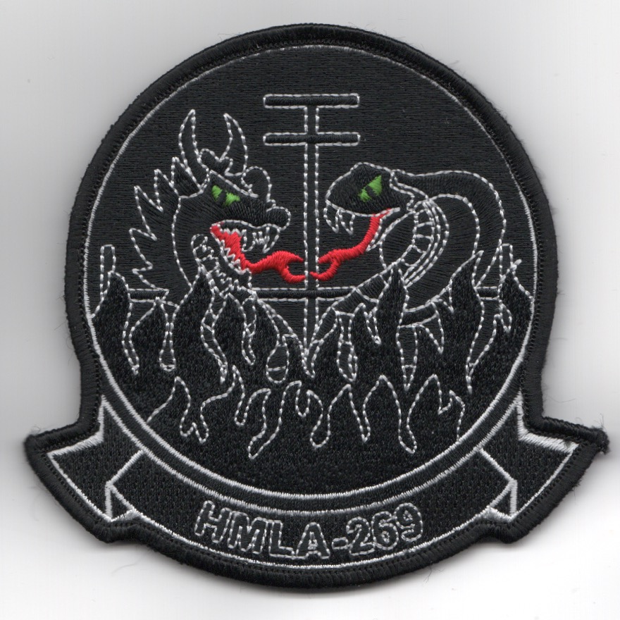 (Another AV8RSTUFF Creation): This is another “Blacked-out” version (with white-outlined letters) of the squadron patch for HMLA-269. HMLA-269 is a United States Marine Corps helicopter squadron consisting of AH-1W SuperCobra attack helicopters and UH-1Y Venom utility helicopters. Also known as “The Gunrunners”, the squadron is based at Marine Corps Air Station New River, North Carolina and falls under the command of Marine Aircraft Group 29 (MAG-29) and the 2nd Marine Aircraft Wing (2nd MAW). This patch come with velcro attached.