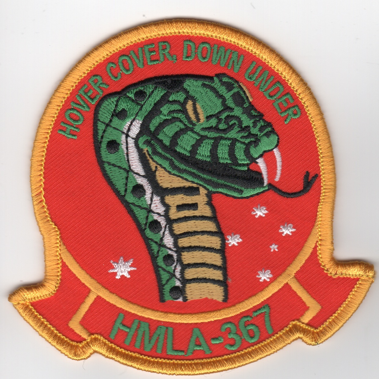 This is the “red” version of the “Hover Cover” series of patches for HMLA-367. They are attached to MAG-39 located at MCAS Camp Pendleton. Their lineage is from VMO-351 (1943), then redesignated as VMO-3, 15 Jan 1944, then deactivated 20 August 1949. They were reactivated as VMO-3, 1 August 1966 and changed to HML-367, 24 March 1968. They were redesignated HMLA-367, 1 January 1988. This unit is a highly decorated unit from Vietnam to present with involvement from Southeast Asia Evac, April 1975 to the Operation Restore Hope – Somalia. This patch was created for a detachment “Down Under” and says “Hover Cover, Down Under” showing the Cobra-head of their mascot.