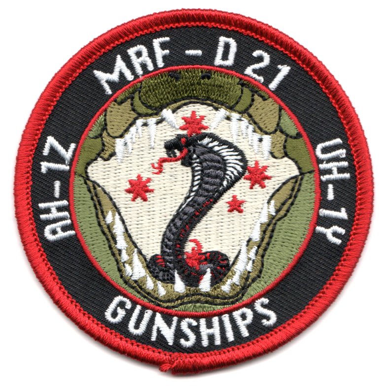 This is the “red/black bullet” version of the “MRF-D 21” DET patch. It was created for one of their deployments, has the designators of their helicopters (AH-1Z and UH-1Y) along the sides, and “GUNSHIPS” along the bottom. This patch does not come with velcro attached.