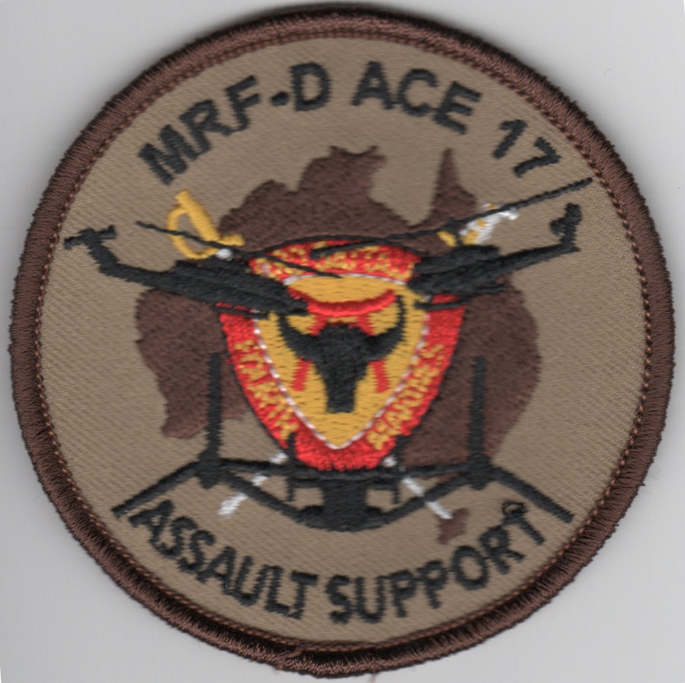 HMLA-367 spends approximately six of each eighteen months split into rotations to Marine Corps Air Station Futenma, Okinawa, Japan as well as attached as Det “A” in Subic Bay, Philippines, and as part of an Aviation Combat Element (ACE) aboard an amphibious assault ship, typically the USS Tarawa (LHA-1) while in rotation with two other squadrons also based at Marine Corps Air Station Camp Pendleton, California. While not on their rotation overseas, HMLA-367 supported major exercises deploying for training frequently to the Marine Corps Air Ground Combat Center Twentynine Palms, California, Marine Corps Air Station Yuma, Arizona, Nellis Air Force Base, Nevada & Naval Air Station Fallon, Nevada. This patch was created for HMLA-367 for one of their deployments/rotations down to Australia and says “MRF-DARWIN”. This is the desert version that says “ASSAULT SUPPORT” along the bottom and does not come with velcro attached.