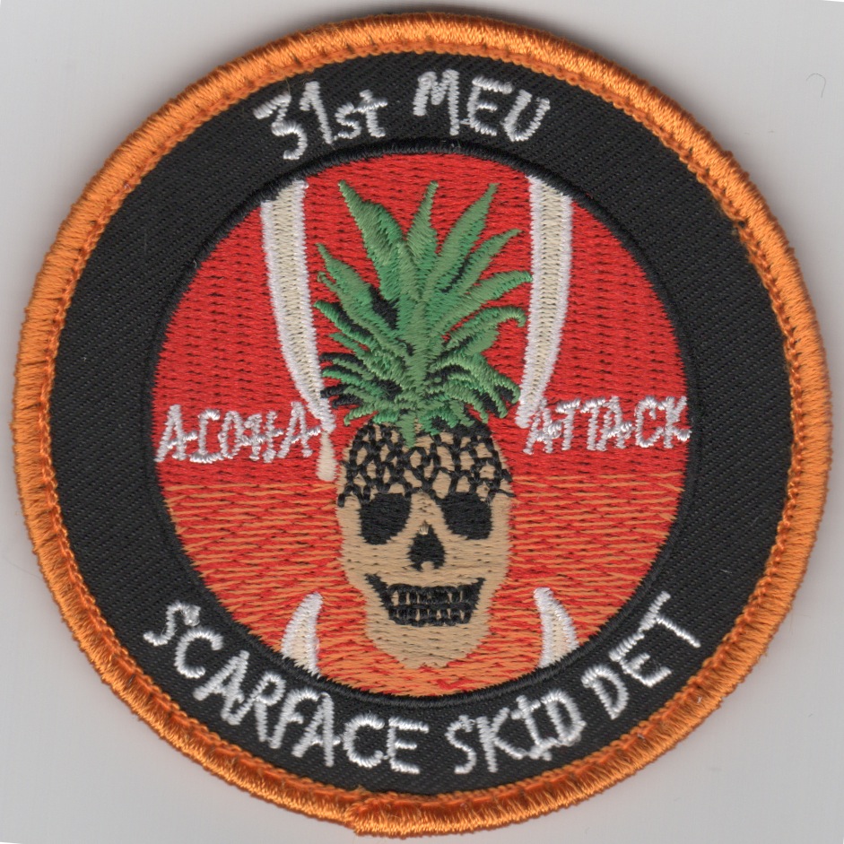 This patch says “31st MEU” (top), “ALOHA ATTACK” (middle) and “SCARFACE SKID DET” (bottom). This patch does come with velcro attached.