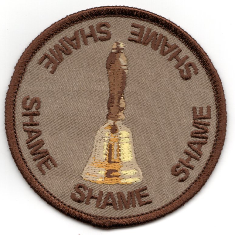 This is the desert version of the squadron’s DETACHMENT patch that says “SHAME-SHAME-SHAME-SHAME-SHAME” along the outer edge with a ‘hand-bell’ in the middle of the patch. I have no idea what it is referencing, I haven’t heard the story from the squadron yet, but it should be pretty funny! This patch does not have velcro attached.