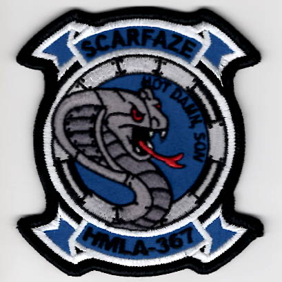 This is the blue-white version of the squadron patch for HMLA-367. They are attached to MAG-39 located at MCAS Camp Pendleton. Their lineage is from VMO-351 (1943), then redesignated as VMO-3, 15 Jan 1944, then deactivated 20 August 1949. They were reactivated as VMO-3, 1 August 1966 and changed to HML-367, 24 March 1968. They were redesignated HMLA-367, 1 January 1988. This unit is a highly decorated unit from Vietnam to present with involvement from Southeast Asia Evac, April 1975 to the Operation Restore Hope – Somalia. This patch has the dark blue background, says “HOT DAMN SON”, and does NOT have velcro on the back.