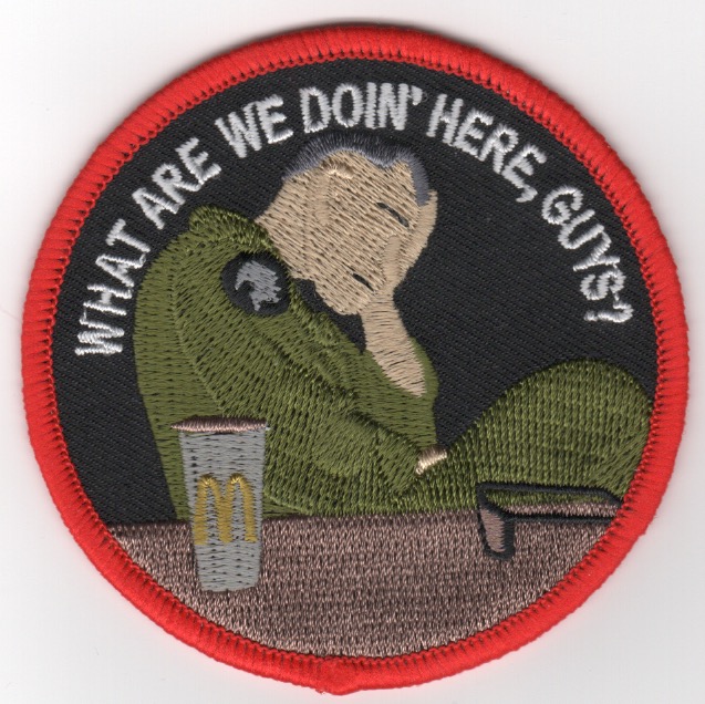 This patch says “What Are We Doing Here, Guys?” and has a McDonald’s cup on the desk….This patch does not come with velcro attached.