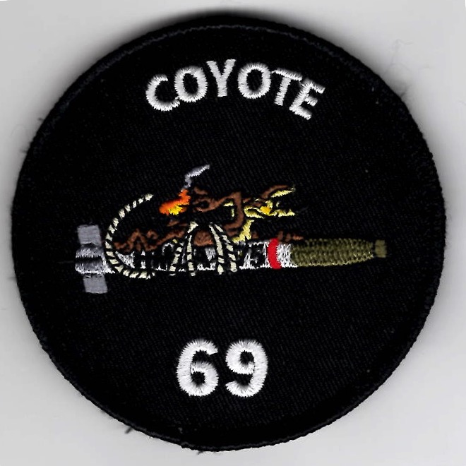 (Another AV8RSTUFF Creation): HMLA-775 created this ‘bullet’ patch depicting their mascot, WILE E. COYOTE, riding the ACME rocket which is labeled as HMLA-775. This patch IS numbered (69 – well….’cause we can) and DOES come with velcro attached.