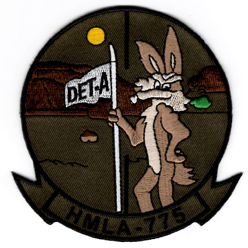 The ‘Coyotes’ of HMLA-775 are a Marine Air Reserve unit located at MCAS Camp Pendleton, CA and report to MAG-46 located at MCAS El Toro, CA. They participated in Desert Storm operating out of King Abdul Aziz air base, Saudi Arabia. This patch is the detachment version of the squadron patch for those deployed with DET “A” and does not come with velcro attached.