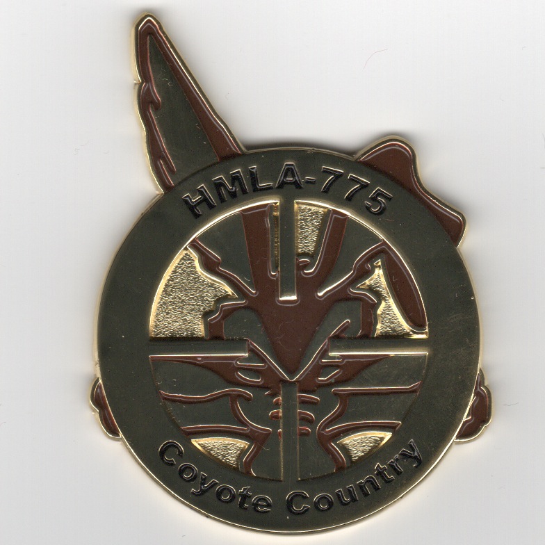 An AV8RSTUFF creation: The ‘Coyotes’ of HMLA-775 are a Marine Air Reserve unit located at MCAS Camp Pendleton, CA and report to MAG-46 located at MCAS El Toro, CA. They participated in Desert Storm operating out of King Abdul Aziz air base, Saudi Arabia. This is the front view of their new squadron coin (the back side is shown below).