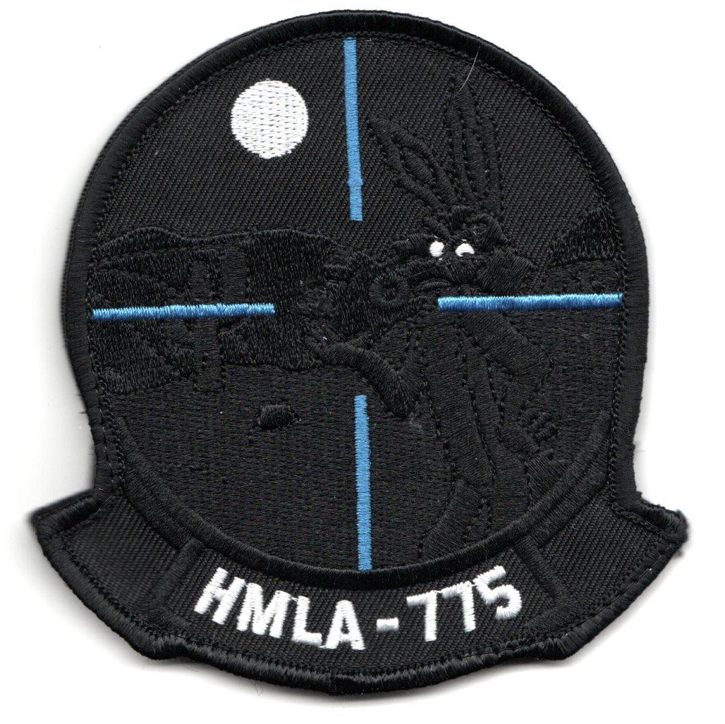 (Another AV8RSTUFF Creation): Marine Light Attack Helicopter Squadron 775 (HMLA-775) is a reserve USMC helicopter squadron consisting of AH-1W SuperCobra attack helicopters and UH-1Y Venom utility helicopters. The squadron was reactivated from cadre status on 1 Oct 2016 and is based at Marine Corps Base Camp Pendleton, California and falls under the command of Marine Aircraft Group 41 (MAG-41) and the 4th Marine Aircraft Wing (4th MAW). The ‘Coyotes’ of HMLA-775 participated in Desert Storm operating out of King Abdul Aziz air base, Saudi Arabia. This patch is the SMALL version of the “BLACKED OUT” version of the squadron patch and already has the velcro on the back.