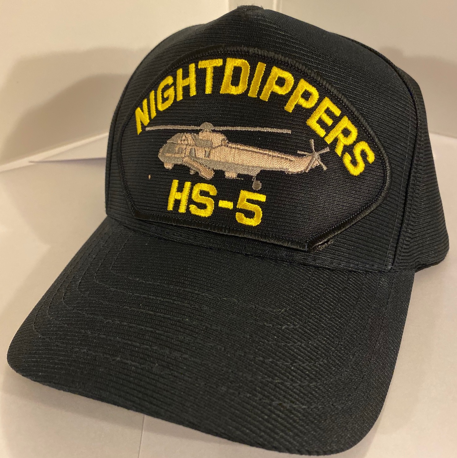 This is the dark blue version of the HS-5 ‘Nightdippers’ Squadron ballcap. It depicts the profile of their helicopter with the text above-&-below.