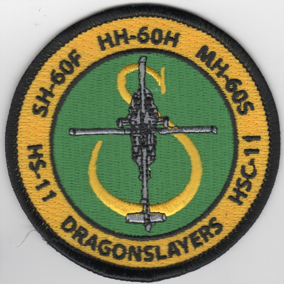 This is the helo “bullet” patch created by HS/HSC-11 to commemorate their renaming. In 2016, HS-11 transitioned to MH-60S and re-designated as HSC-11. This patch does not have velcro attached.