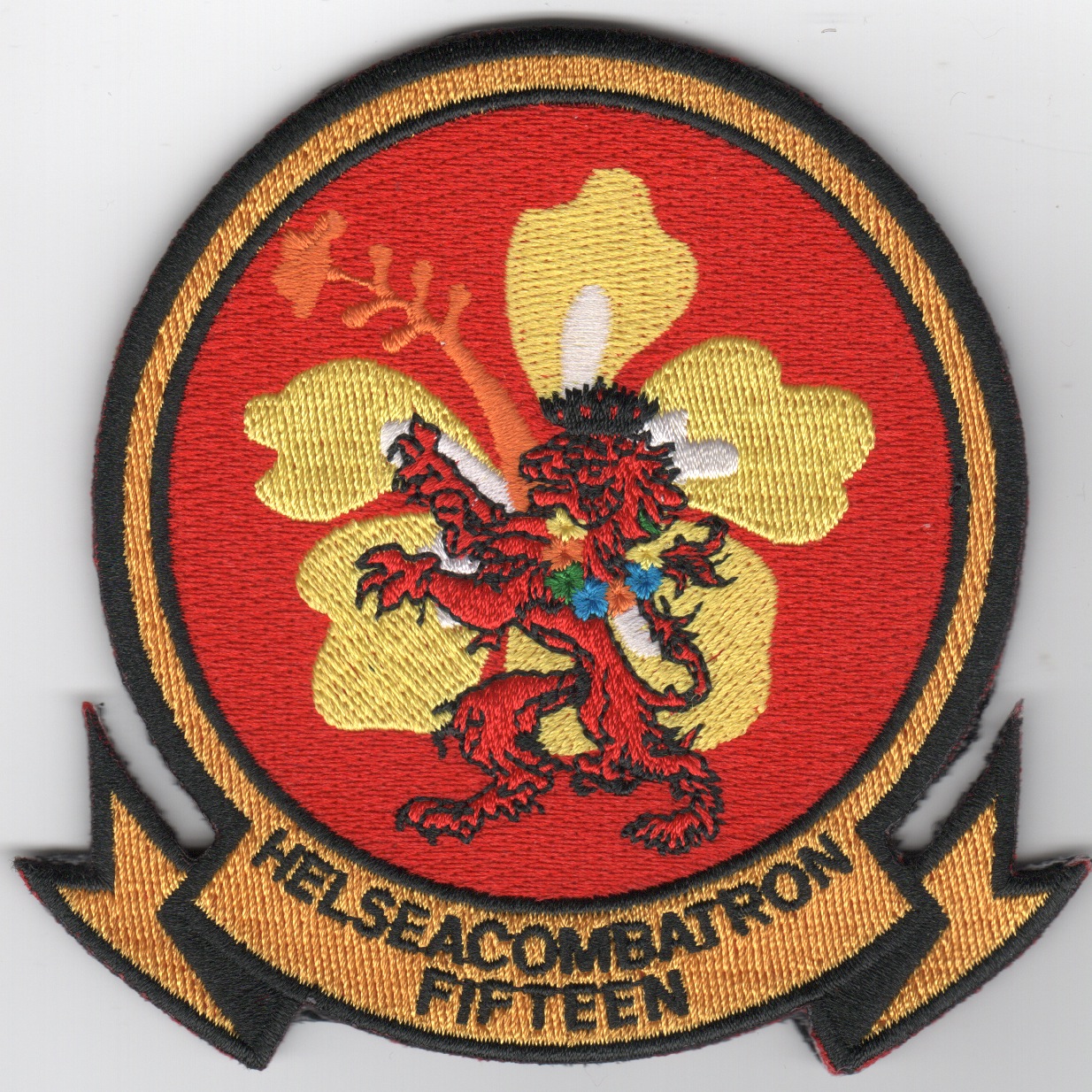 On arriving back to homeport San Diego, HS-15 began transitioning to the new MH-60S helicopter, and the squadron was officially redesignated as HSC-15 on 15 November 2012.Ê During their tenure, the Red Lions have proven their valor over the past few years, executing their primary mission in an operational environment, but were decommissioned in early 2017. In order to help the squadron during this period, we offered and purchased ALL their remaining items in order to alleviate the stress of getting rid of everything at the end, and this “RIMPAC” patch was in the stash of items we purchased. This patch was created for one of their many deployments, and is different from their regular squadron patch, as this one has a flower/plant of some sort in the middle of the patch and the lion (mascot) is wearing a leia……and this patch has velcro on the back of it. Only a few of these, so get them while they last!