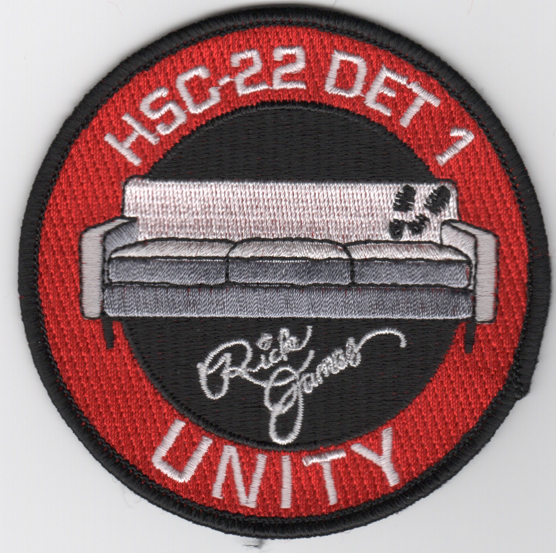 This is HSC-22 DET-1 “”””UNITY”””” patch showing footprints on a couch with the words “”””RICK JAMES”””” under the couch. Haven’t gotten the full story on this one yet……