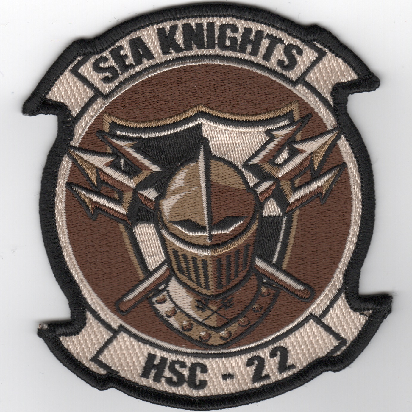 This is the desert version of the new squadron patch created for HSC-22. Helicopter Sea Combat Squadron 22 (HSC-22) is a United States Navy helicopter squadron based at NAS Chambers Field (KNGU) in Norfolk, Virginia. The “Sea Knights” were Established on September 29, 2006, and have multiple missions including vertical replenishment, search and rescue, air-sea rescue and anti-surface warfare. The Sea Knights fly the MH-60S helicopter, manufactured by Sikorsky Aircraft in Stratford, Connecticut. This patch does not have velcro attached.