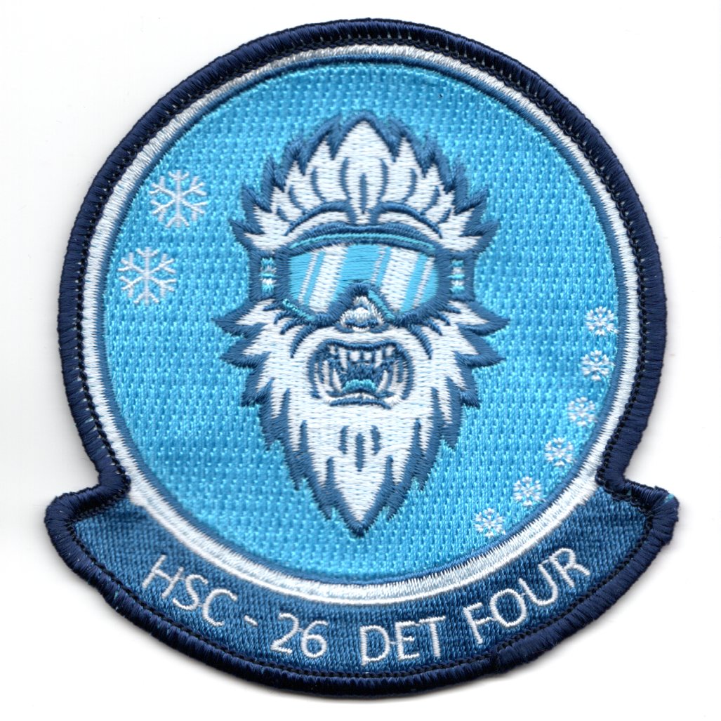This is the blue/white version of the squadron patch for HSC-26, DET-4 deployers. It shows an ABOMINABLE snowman (or YETI) wearing snow-skiing goggles with snow coming down. This patch does not come with velcro attached.