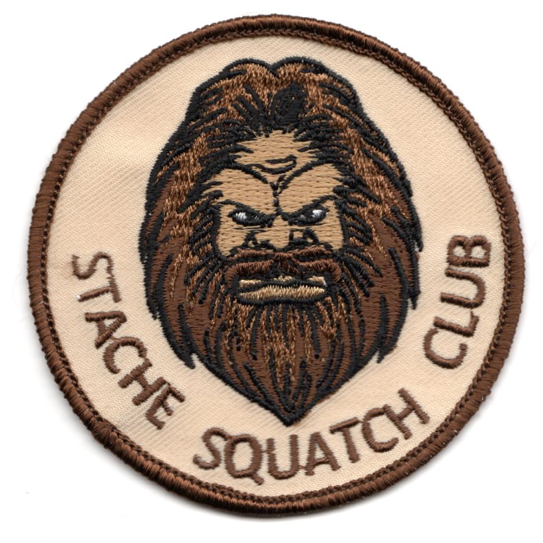 This is the desert version of the aircraft ‘bullet’ patch for HSC-26, DET-4 deployers. It shows a “sasquatch’s face” (or YETI) and says “STACHE SQUATCH CLUB”. This patch does not come with velcro attached.