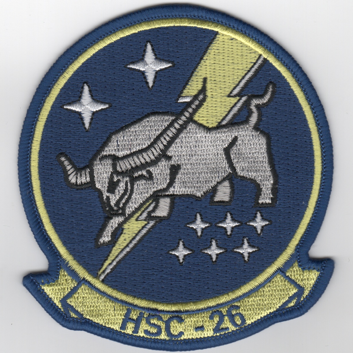 This is the dark blue/yellow version of the squadron patch for HSC-26. It features a bull on top of a lightning bolt. This patch does not come with velcro attached.