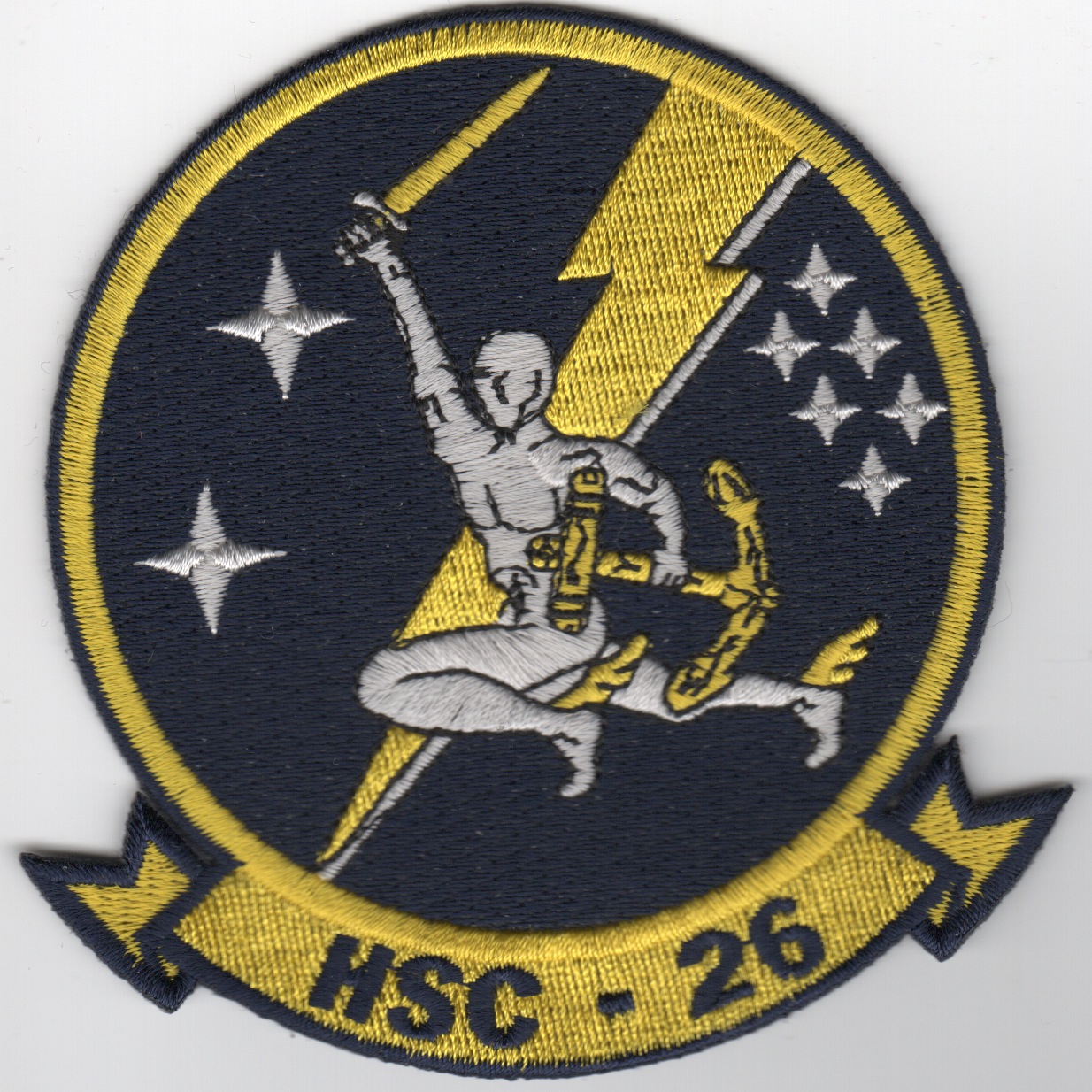 This is the dark blue/yellow version of the squadron patch for HSC-26. It features a man holding an anchor on top of a lightning bolt. This patch does not come with velcro attached.