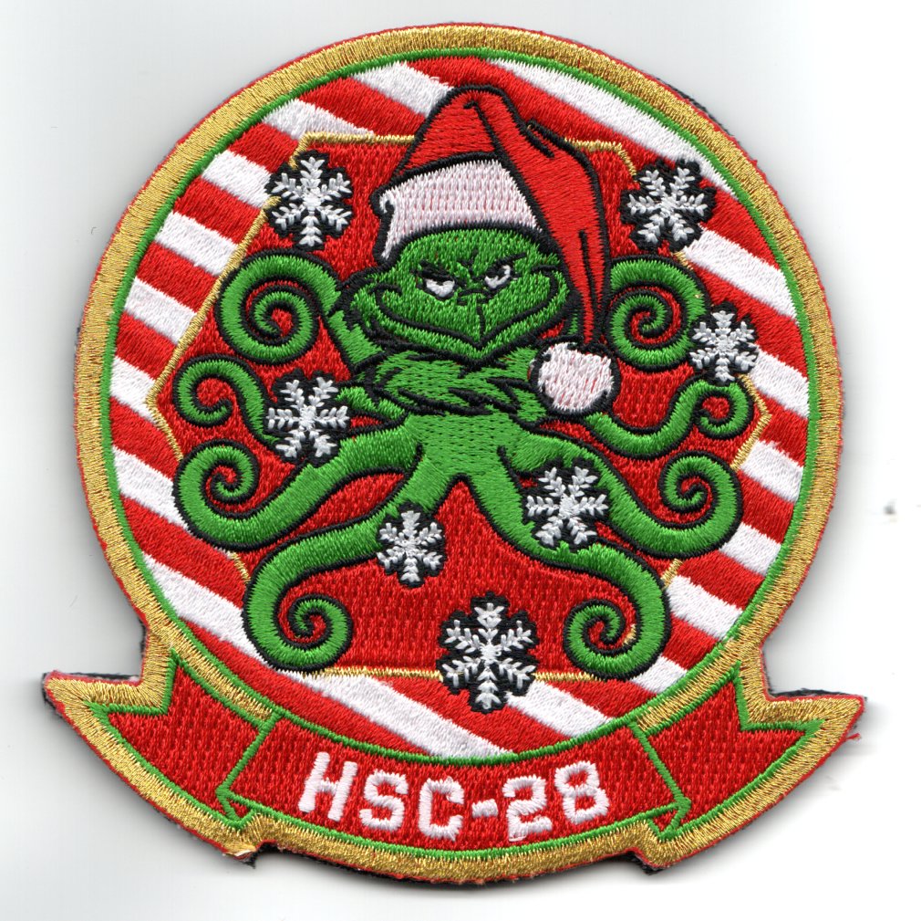 (Another AV8RSTUFF Creation): This is another version of the ‘CHRISTMAS’ squadron patch for HSC-28. You can see the history of the squadron above. This is a very rare, limited quantities patch they created for Christmas 2021 and does come with velcro attached. This version has the “Green GRINCH” on the mascot body.