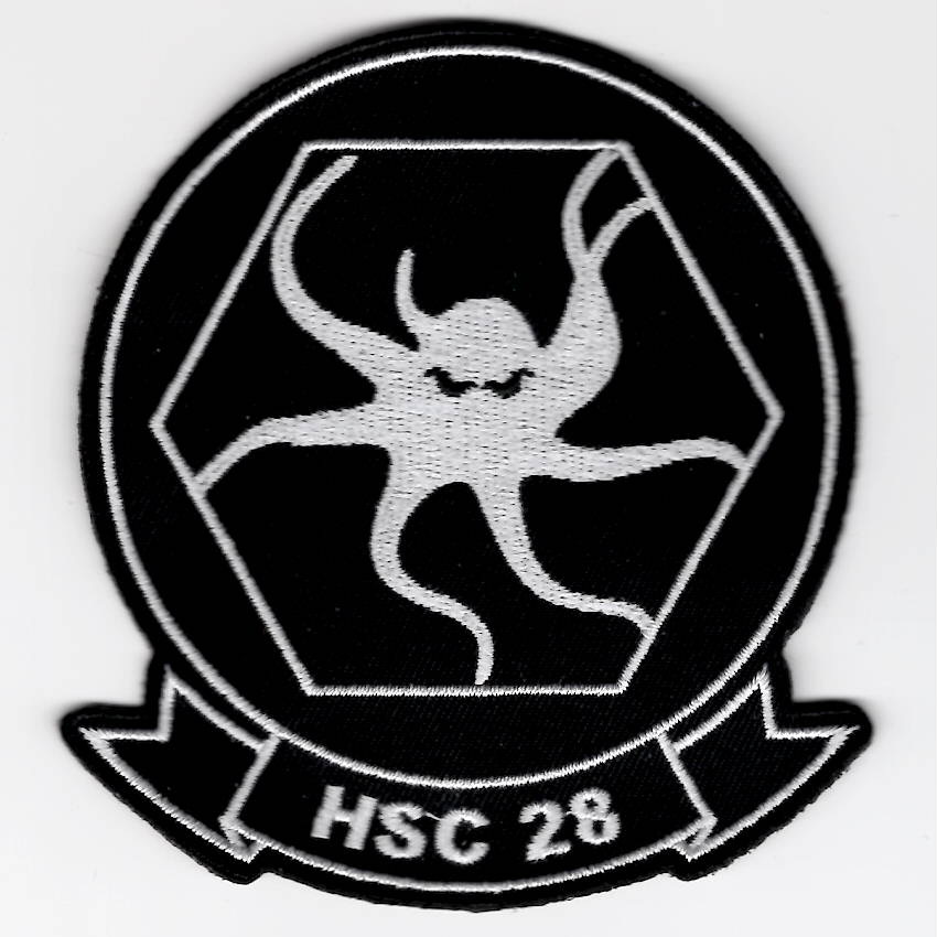 (Another AV8RSTUFF Creation): This is the black/white version of the squadron patch created for HSC-28 DET-1’s 2024 deployment. Helicopter Combat Support Squadron 8 (HC-8) was established 3 December 1984, then redesignated in early 2005 as Helicopter Sea Combat Squadron 28 (HSC-28) as part of a merger of the HC and helicopter anti-submarine (HS) communities. The change came as a result of the introduction of the MH-60S Knighthawk, replacing the CH-46D Sea Knight, UH-3H Sea King and the SH-60F Seahawk, and the future introduction of the MH-60R Seahawk, which is replacing the SH-60B Seahawk. This patch does not come with velcro attached.