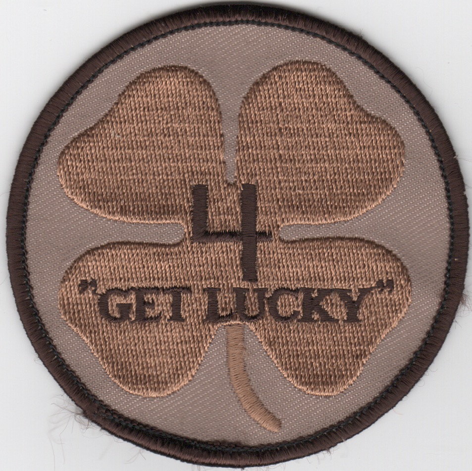 This is a desert-colored detachment patch created for HSC-28, Det-4. It shows a 4-leaf clover with the Det number and the words “Get Lucky” at the bottom.