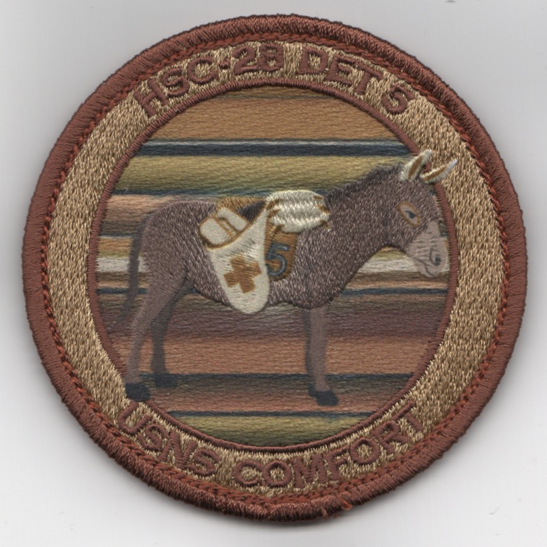 This is the desert version of one of the detachment patches created for HSC-28, Det-5 while onboard US Naval Ship (USNS) COMFORT. It shows a ‘burro’ (not sure why) carrying a FIRST AID package on the pattern of a Mexican blanket. This patch DOES have velcro attached.