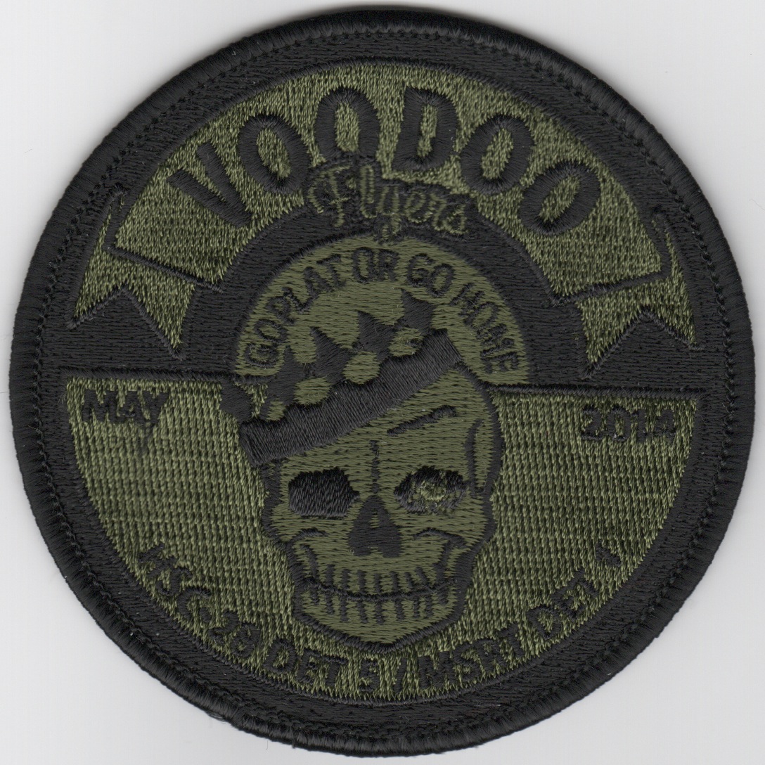 This is subdued version of the detachment patch created for HSC-28, Det-5. It says “VOODOO FLYERS” across the top, with the date May 2014 in the middle and a skull/crown in the middle.