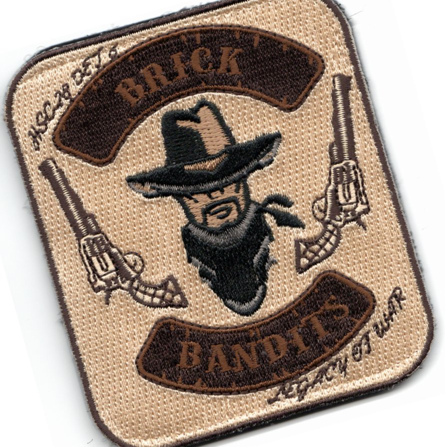 (Another AV8RSTUFF Creation): This is the desert-background version of the ‘BRICK BANDITS’ of HSC-28 for their DET-6. It has a Wild West Cowboy with pistols on each side, and says “LEGACY OF WAR”(bottom right) and does come with velcro attached.