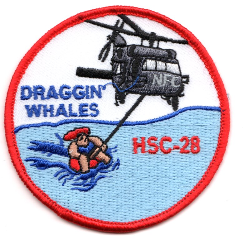 Helicopter Combat Support Squadron (HC) 8 was redesignated, in early 2005, Helicopter Sea Combat Squadron (HSC) 28 as part of a merger of the HC and helicopter anti-submarine (HS) communities. The change came as a result of the introduction of the MH-60S Knighthawk, replacing the CH-46D Sea Knight, UH-3H Sea King and the SH-60F Seahawk, and the future introduction of the MH-60R Seahawk, which is replacing the SH-60B Seahawk. This depicts the helo dragging a large person on an inner-tube and says NFC (or NFO) on the nose of the helo. This patch does not come with velcro attached.