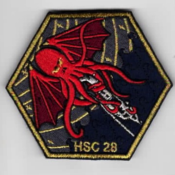 (Another AV8RSTUFF Creation): When sailors first discovered Octopus, they had no idea what this creature was. They could only associate it with things they knew, as it was mystifying like a dragon and lumbered through the sea like a whale. Before they were called Octopus for their eight legs, they weÕre known to those at sea as ÒDragon Whales!Ó. Helicopter Combat Support Squadron (HC) 8 was redesignated, in early 2005 as Helicopter Sea Combat Squadron 28 (HSC-28 The ÒDragon Whales!Ó) as part of a merger of the HC and helicopter anti-submarine (HS) communities. The change came as a result of the introduction of the MH-60S ÒKnighthawkÓ, replacing the CH-46D ÒSea KnightÓ, UH-3H Sea King and the SH-60F Seahawk, and the future introduction of the MH-60R Seahawk, which is replacing the SH-60B Seahawk. This patch was created to commemorate a “HALLOWEEN” theme (note the bat-wings) and DOES come with velcro attached.
