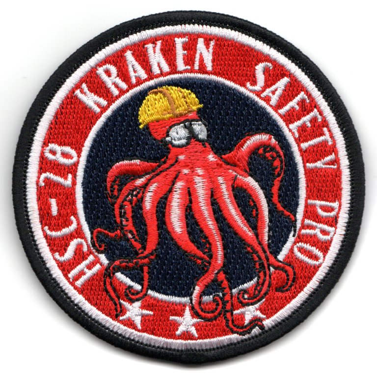 (Another AV8RSTUFF Creation): This patch was created for HSC-28 for their “”””SAFETY PRO”””” division and shows their mascot (the KRACKEN) wearing a safety hard-hat. This patch does come with velcro attached.