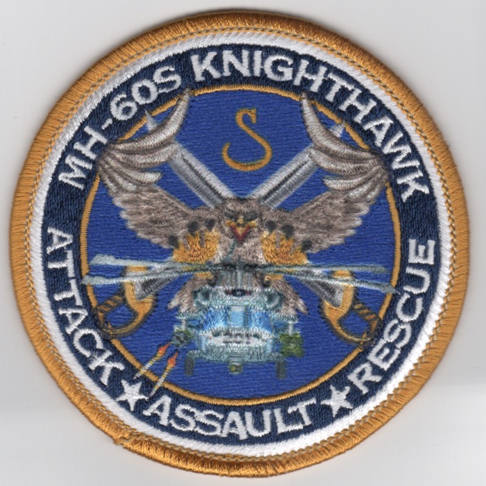 Another AV8RSTUFF creation: This is the SUBLIMATED version of the’gold-bordered’ version of the HSC-28 MH-60S ‘Knighthawk’ patch. It says “”””ATTACK * ASSAULT * RESCUE”””” along the bottom and DOES NOT come with velcro attached.