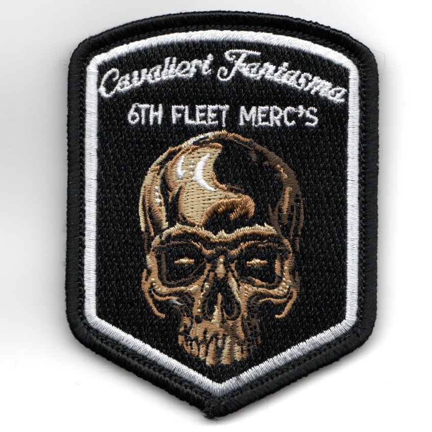 (Another AV8RSTUFF Creation): This is the black version of the HSC-28 ‘SIXTH FLEET MERCS’ patch that says “CAVALIERI FANTASMA” (Latin for something to do with Indiana Jones, I think). Its has a skull image on the front and does come with velcro attached.