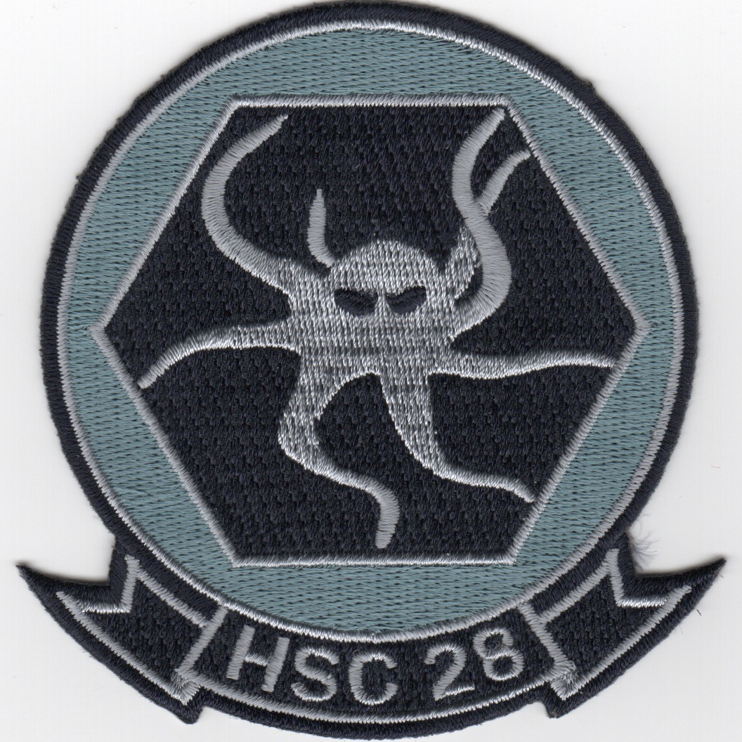 This is the medium-sized, blue version of the squadron patch for HSC-28. Helicopter Combat Support Squadron (HC) 8 was redesignated, in early 2005 asÊHelicopter Sea Combat Squadron 28 (HSC-28ÊThe ÒDragon Whales!Ó)Êas part of a merger of the HC and helicopter anti-submarine (HS) communities. The change came as a result of the introduction of the MH-60S ÒKnighthawkÓ, replacing the CH-46D ÒSea KnightÓ, UH-3H Sea King and the SH-60F Seahawk, and the future introduction of the MH-60R Seahawk, which is replacing the SH-60B Seahawk. TheÊDragon WhalesÊof HC-8ÊflewÊtheÊCH-46ÒSea KnightÓÊand performed search and rescue and vertical replenishment in support of the Atlantic Fleet. HC-8 also operated the Atlantic Fleet Helicopter Operations School (HELIOPS) providing Landing Signalman Enlisted (LSE), Helicopter Instrument Ground School (HIGS), Helicopter Control Officer (HCO), and night vision goggles training. ÊHSC-28 now flies solely the MH-60S ÒKnighthawkÓÊto perform Search and Rescue (SAR) and vertical replenishment (VERTREP) as well as, with the implementation of the armed helo upgrade, the ability to support Special Operation Forces (SOF), Anti-Surface Warfare (ASUW), and Personnel Recovery (PR) mission areasÊin support of the Atlantic Fleet.