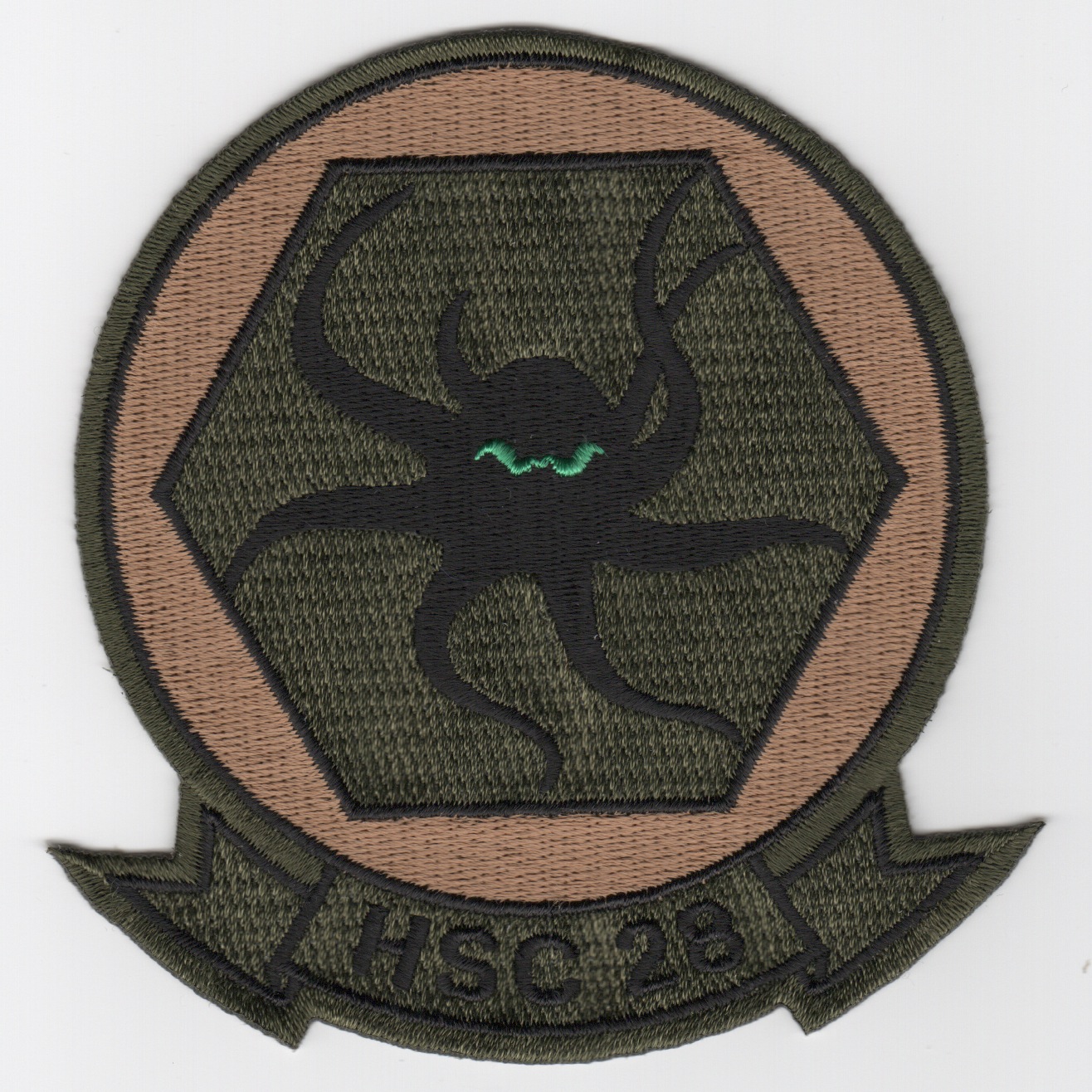 This is the regular-sized, subdued-version of the squadron patch for HSC-28. Helicopter Combat Support Squadron (HC) 8 was redesignated, in early 2005 asÊHelicopter Sea Combat Squadron 28 (HSC-28ÊThe ÒDragon Whales!Ó)Êas part of a merger of the HC and helicopter anti-submarine (HS) communities. The change came as a result of the introduction of the MH-60S ÒKnighthawkÓ, replacing the CH-46D ÒSea KnightÓ, UH-3H Sea King and the SH-60F Seahawk, and the future introduction of the MH-60R Seahawk, which is replacing the SH-60B Seahawk. TheÊDragon WhalesÊof HC-8ÊflewÊtheÊCH-46ÒSea KnightÓÊand performed search and rescue and vertical replenishment in support of the Atlantic Fleet. HC-8 also operated the Atlantic Fleet Helicopter Operations School (HELIOPS) providing Landing Signalman Enlisted (LSE), Helicopter Instrument Ground School (HIGS), Helicopter Control Officer (HCO), and night vision goggles training. ÊHSC-28 now flies solely the MH-60S ÒKnighthawkÓÊto perform Search and Rescue (SAR) and vertical replenishment (VERTREP) as well as, with the implementation of the armed helo upgrade, the ability to support Special Operation Forces (SOF), Anti-Surface Warfare (ASUW), and Personnel Recovery (PR) mission areasÊin support of the Atlantic Fleet.
