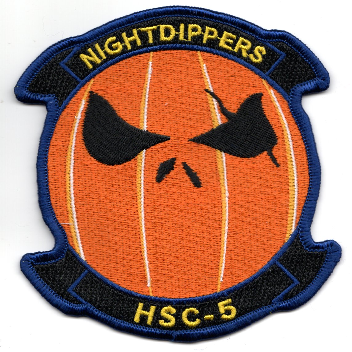 Helicopter Sea Combat Squadron FIVE (HSC-5) (previously Helicopter Anti-Submarine Squadron FIVE (HS-5)), also known as the ‘Nightdippers’, is a helicopter squadron of the US Navy based at Naval Station Norfolk operating the Sikorsky MH-60S Seahawk. The Nightdippers are (2018-2019) currently part of Carrier Air Wing Seven (CVW-7) and deploy aboard USSÊHarry S. TrumanÊ(CVN-75) to provide anti-surface warfare (ASW), search and rescue (SAR), vertical replenishment (VERTREP), Combat Search and Rescue (CSAR) and Naval Special Warfare Support capabilities to the Carrier Strike Group. This is *HALLOWEEN* version of their squadron patch with an orange pumpkin face and does not have velcro attached.