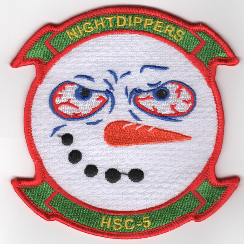 This is the ‘SNOWMAN’ version of the HSC-5 ‘NIGHTDIPPERS’ deployment patch. They were deployed over the holidays, so the snowman with the carrot-nose was created for their disdain for being gone from family members during the ‘most wonderful time of the year’. This patch does not have velcro attached.