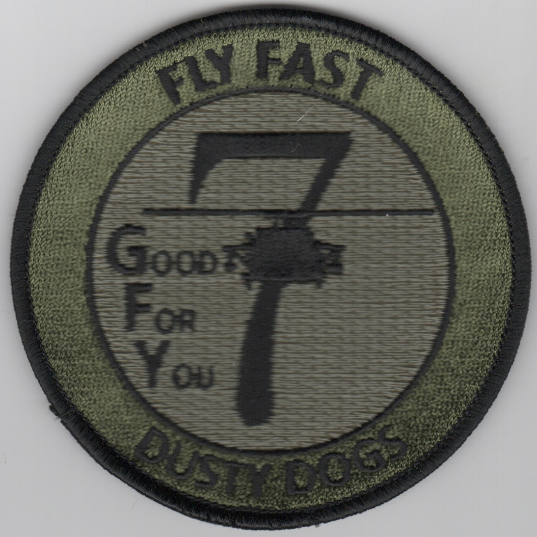 This is the subdued version of the HSC-7 “Fly Fast” patch and says “Good For You”. HSC-7 Helicopter Sea Combat Squadron Seven, also known as the “Dusty Dogs”, is a United States Navy helicopter squadron located at Naval Station Norfolk, VA. The Dusty Dogs are (CAO Feb 2016) attached to Carrier Air Wing Three and deploy aboard the aircraft carrier USSÊDwight D. Eisenhower.