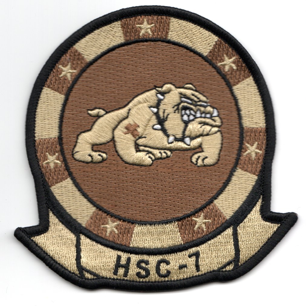 This is the ‘desert’ version of the HSC-7 “BULLDOG” squadron patch. HSC-7 Helicopter Sea Combat Squadron Seven, also known as the “Dusty Dogs”, is a USN helicopter squadron located at NAS Norfolk, VA. The Dusty Dogs are (CAO Feb 2016) attached to Carrier Air Wing Three and deploy aboard the aircraft carrier USSÊDwight D. Eisenhower. This patch does not have velcro attached.