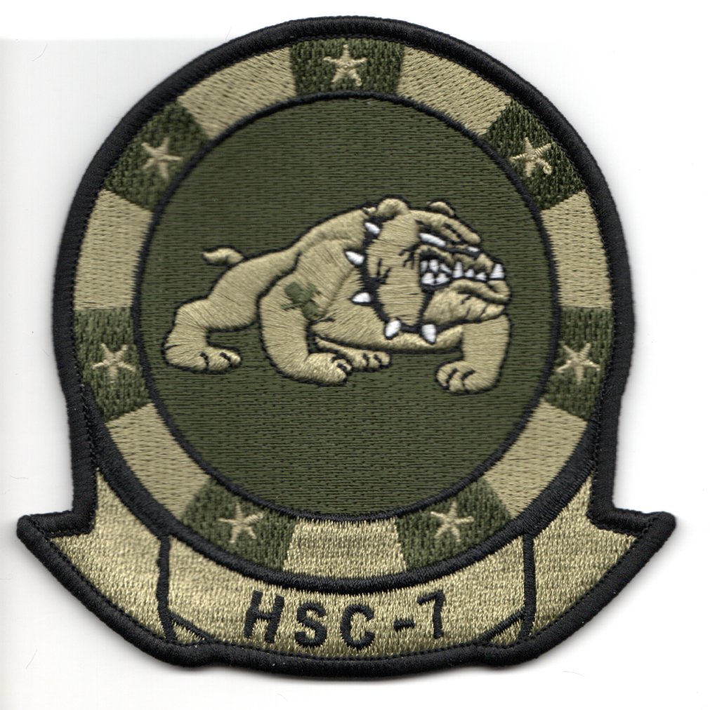 This is the ‘subdued’ version of the HSC-7 “BULLDOG” squadron patch. HSC-7 Helicopter Sea Combat Squadron Seven, also known as the “Dusty Dogs”, is a USN helicopter squadron located at NAS Norfolk, VA. The Dusty Dogs are (CAO Feb 2016) attached to Carrier Air Wing Three and deploy aboard the aircraft carrier USSÊDwight D. Eisenhower. This patch does not have velcro attached.
