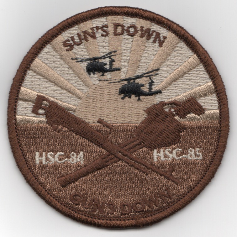 This is the desert version of the joint patch between HSC-84 and HSC-85. It shows “crossed guns” and says “SUN’S DOWN” along the top, “GUN’S DOWN” along the bottom. This patch does not have velcro.