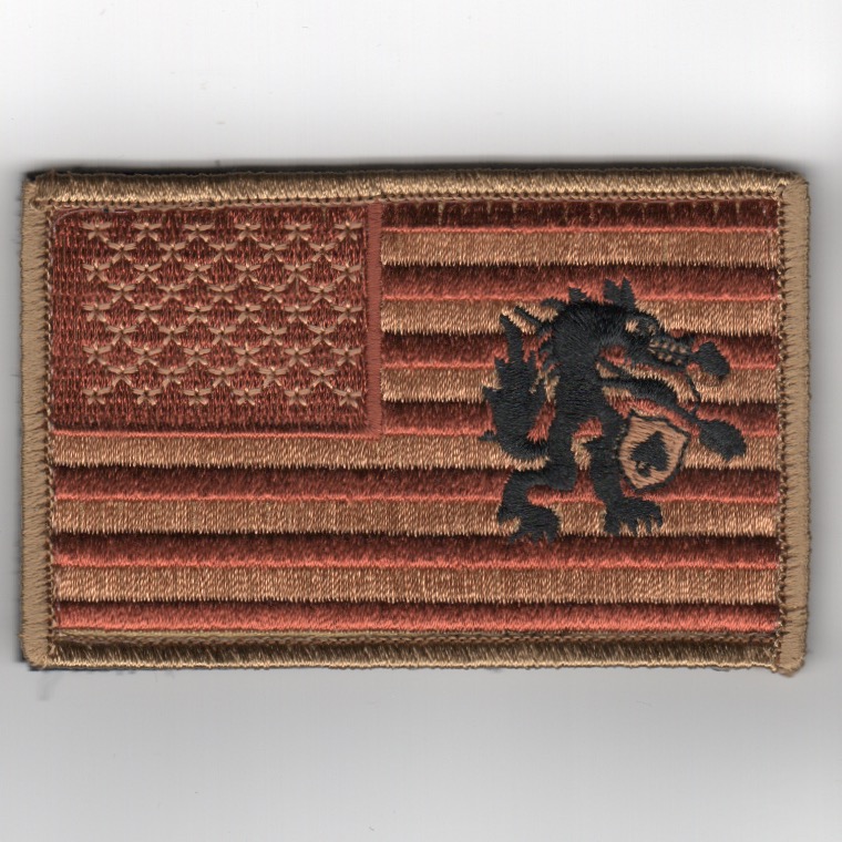 (Another AV8RSTUFF Creation): This is the desert version of the “”””FLAG”””” patch with the “”””Black Lowenbrough Wolf”””” (since HSC-84 is the “”””WOLVES””””) worn on the right sleeve of the flight suit by the operators at HSC-84. This patch already has the velcro attached.