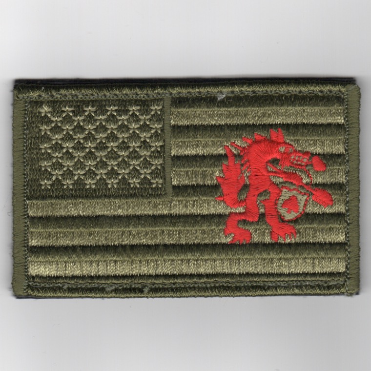 (Another AV8RSTUFF Creation): This is the subdued OCP version of the “”””FLAG”””” patch with the “”””Black Lowenbrough Wolf”””” (since HSC-84 is the “”””WOLVES””””) worn on the right sleeve of the flight suit by the operators at HSC-84. This patch already has the velcro attached.