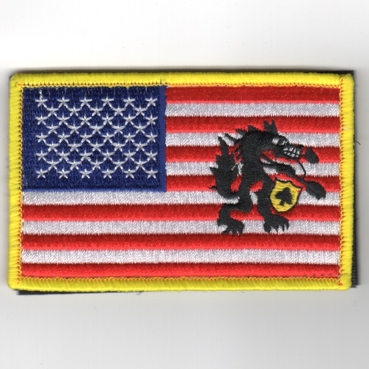 (Another AV8RSTUFF Creation): This is the standard version of the “”””FLAG”””” patch with the “”””Black Lowenbrough Wolf”””” (since HSC-84 is the “”””WOLVES””””) worn on the right sleeve of the flight suit by the operators at HSC-84. This patch already has the velcro attached.