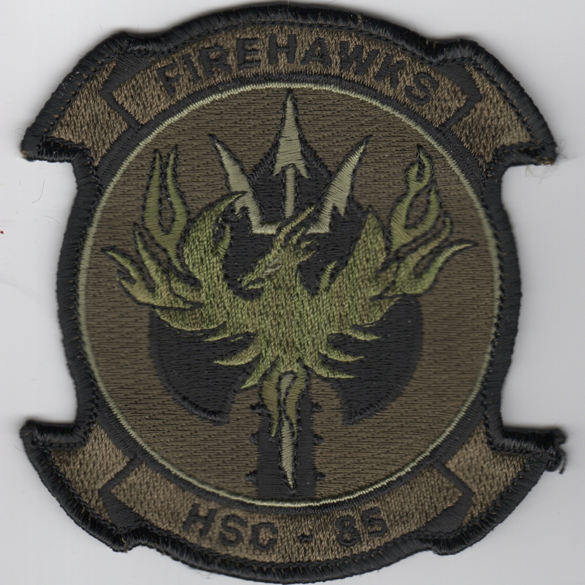 This is the subdued version the squadron patch for the HSC-85 “Firehawks”. Helicopter Sea Combat Squadron 85 (HSC-85) Firehawks is a United States Navy Reserve helicopter squadron based at Naval Air Station North Island, San Diego, California. HSC-85 currently flies the HH-60H Seahawk. This squadron is one of only two Navy helicopter squadrons dedicated to Special Operations support as a primary role. This patch does not have velcro attached.