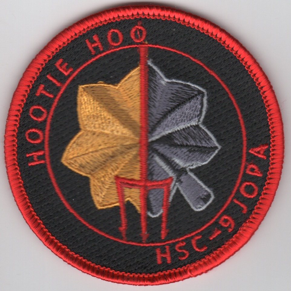 HSC-9 is a United States Navy helicopter squadron based at Naval Air Station Norfolk, Norfolk, Virginia. They are attached to Carrier Air Wing Eight and deploys aboard USSÊGeorge H.W. BushÊ(CVN-77). HSC-9 was redesignated from HS-3 on 1 June 2009. Their primary mission is to employ the versatility of the MH-60S helicopter to support the battle group commander’s objectives, with emphasis on Anti-Surface Warfare (ASUW), Combat Search and Rescue (CSAR), support of Special Operations, and Vertical Replenishment (VERTREP). Secondary missions include Anti-Ship Missile defense and Medical Evacuation (MEDEVAC). This is the ‘JOPA’ patch created for the Junior Officers and does not come with velcro attached.