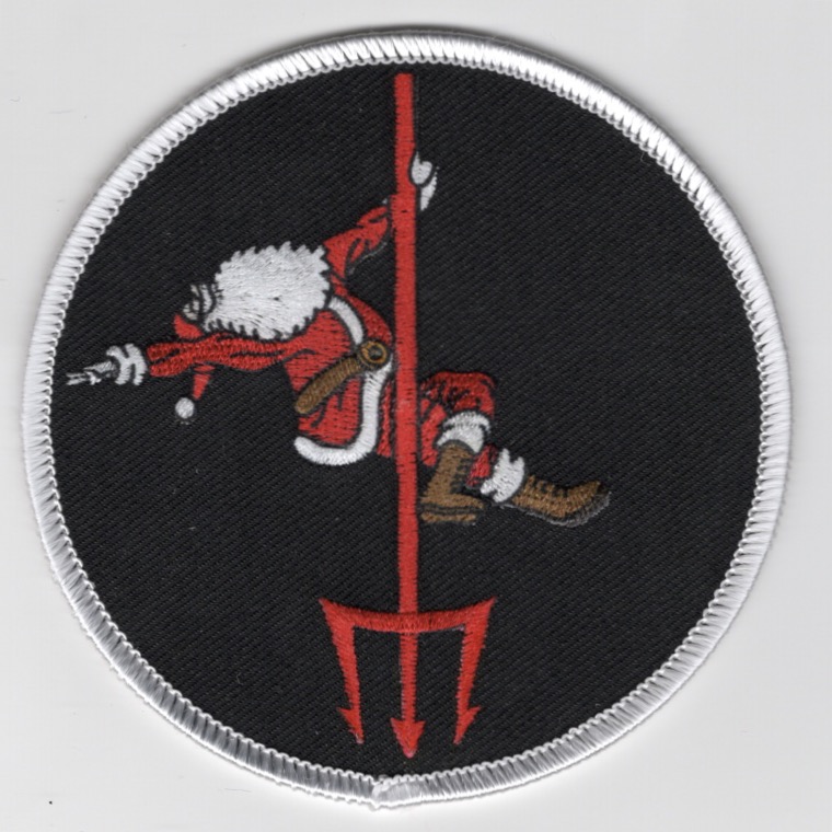 HSC-9 is a US Navy helicopter squadron based at NAS Norfolk, VA. They are attached to Carrier Air Wing Eight (CVW-8) and deploys aboard USSÊGeorge H.W. BushÊ(CVN-77). HSC-9 was redesignated from HS-3 on 1 June 2009. This is the white-bordered version of their CHRISTMAS patch that shows the “Stripper Santa” on the pole and does not come with velcro attached.