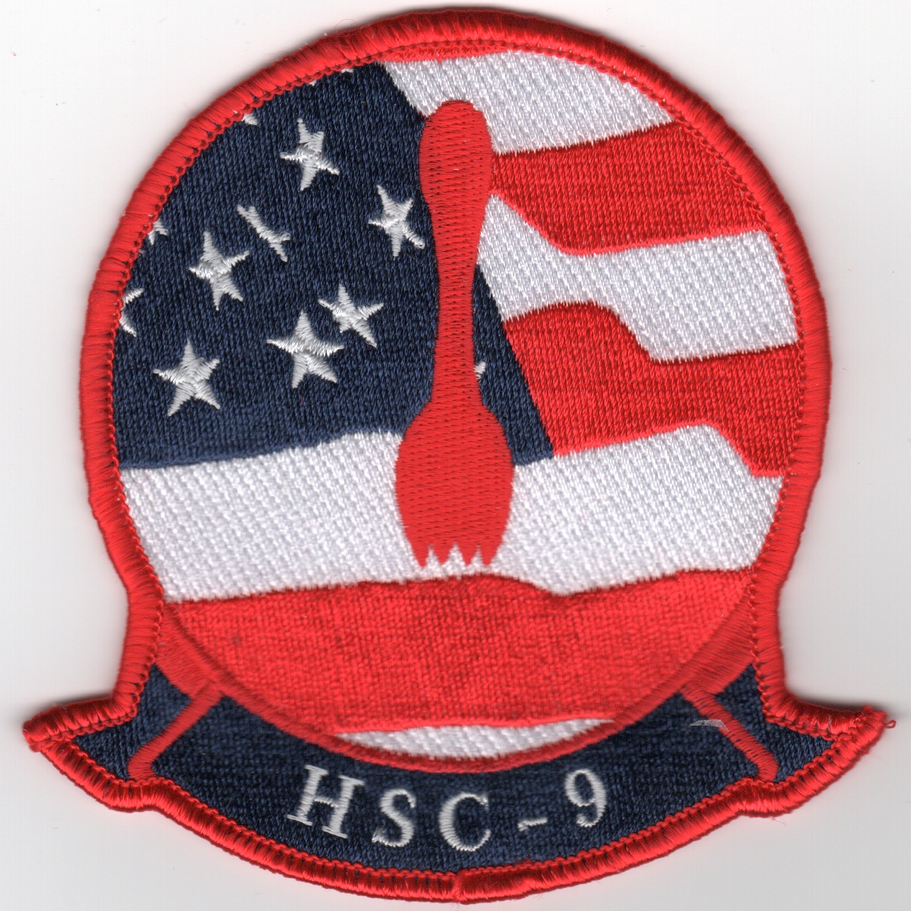 HSC-9 is a United States Navy helicopter squadron based at Naval Air Station Norfolk, Norfolk, Virginia. They are attached to Carrier Air Wing Eight and deploys aboard USSÊGeorge H.W. BushÊ(CVN-77). HSC-9 was redesignated from HS-3 on 1 June 2009. This is the Red/White/Blue version of their squadron patch showing the “SPORK” (Spoon/Fork combination) and does not come with velcro attached.