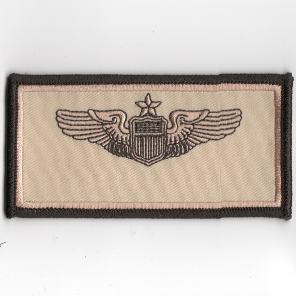 This is the desert version of the USAF Senior-rated PILOT version of the HSC Weapons School nametag for the US Pacific Fleet. It has ONLY the USAF SR Pilot wings on it and does NOT come with velcro attached so that you can have it personalized.