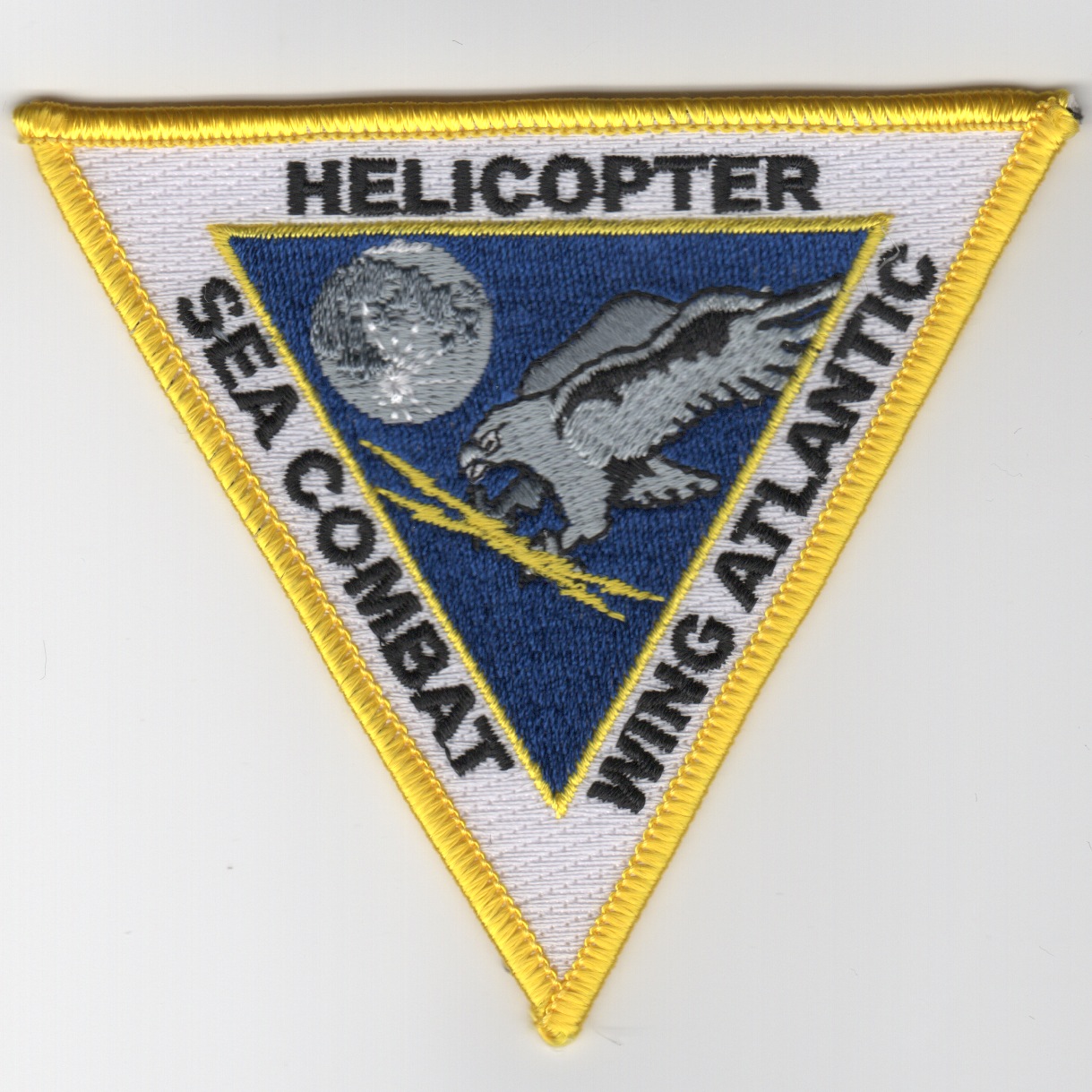 This is the yellow-bordered version of the schoolhouse patch for the Helicopter Sea Combat Wing, Atlantic.