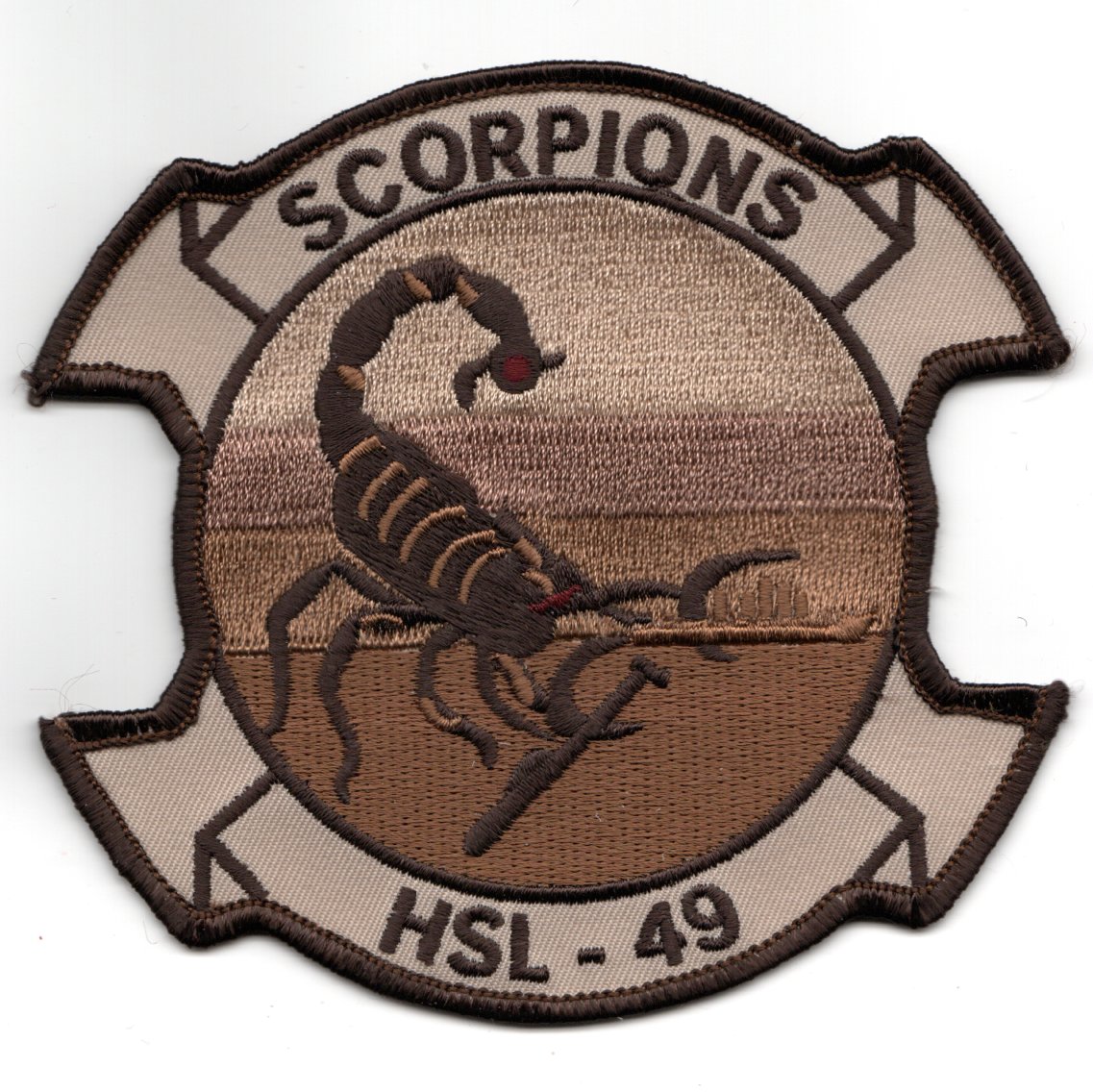 Helicopter Maritime Strike Squadron 49 (HSM-49, formerly known as HSL-49) is a US Navy Maritime Strike helicopter squadron based at NAS North Island, CA. The Scorpions of HSM-49 are an operational fleet squadron based at NAS North Island. Their tailcode is TX and their radio callsign is “Red Stinger”. The squadron provides combat-ready pilots, aircrewmen, technicians, and aircraft to Pacific Fleet warships. The squadron operates the MH-60R Seahawk helicopter. This is the desert version of the HSL-49 Squadron patch for the “Scorpions” and does not come with velcro attached.